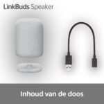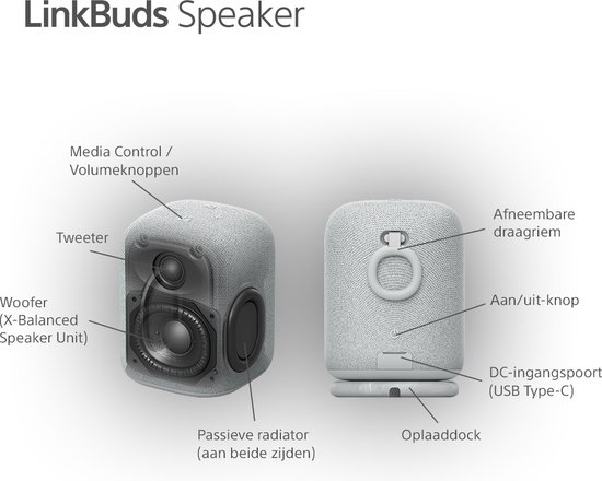 De LinkBuds Speaker is verkrijgbaar in lichtgrijs en zwart, met een strak design dat in elk interieur past. Hij heeft een stijlvol oplaaddock en een afneembare riem voor eenvoudig dragen of ophangen. Het heldere, gedetailleerde geluid is ideaal voor muziek, luisterboeken of podcasts. Handsfree bellen is mogelijk dankzij een knop voor oproepen en een microfoon die helder geluid opvangt. Met Multipoint Connection kun je twee apparaten tegelijk koppelen, en Auto Switch zorgt voor naadloze overgangen tussen de speaker en Sony-hoofdtelefoons. Quick Access maakt starten met Spotify, Amazon Music of Endel met één druk op de knop mogelijk.